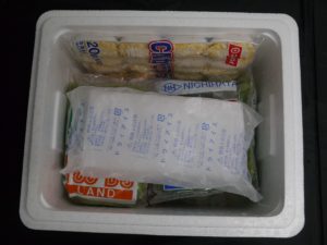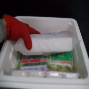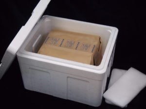 Put the frozen item first. Then place the dry ice on top so that the cold air will sink. Once the foam box is closed, do not open the box until use.